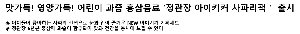 한편, ‘정관장 아이키커 사파리팩’은 100㎖ 24포로 구성되어 전국 트레이더스 및 백화점, 대형마트 내 정관장 매장에서 구매가 가능하다. <끝>