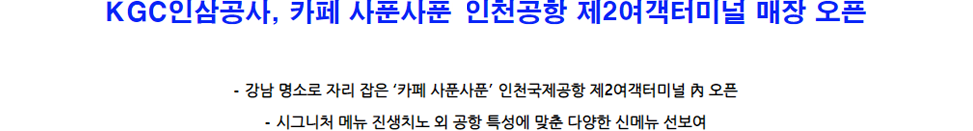 KGC인삼공사(대표이사 박정욱)가 18일 인천국제공항 제2여객터미널(이하T2) 개항에 맞춰 건강 라이프스타일 카페 ‘사푼사푼’을 오픈한다.