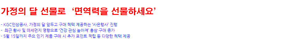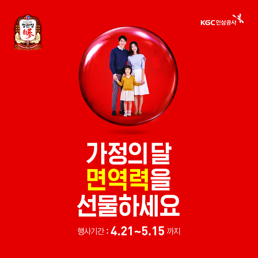 KGC인삼공사는 5월 가정의 달을 맞아 ‘면역력을 선물하세요!’ 행사를 5월 15일까지 진행한다.이 행사는 가족과 지인에게 선물하기 좋은 약 20종의 선물세트 및 ‘홍삼달임액’, ‘홍삼톤골드’, ‘화애락’, ‘홍천웅’ 등 주요 제품에 대해 구매 혜택을 제공하며, 4월 30일까지 제품 구매 시 멤버스 포인트 5% 추가 적립 혜택이 있다.KGC인삼공사는 미세먼지, 황사 등 다양한 유해환경 속에서 건강의 중요성이 강조되어 올해 가정의 달 사은행사 테마를 ‘면역력’으로 설정하였다고 밝혔다. 홍삼은 식약처로부터 면역력 증진의 기능성을 인정받았고, 미세먼지로 인한 폐염증 개선에 도움을 준다는 연구결과도 밝혀지면서 수요가 증가하고 있다.KGC인삼공사에 따르면, 홍삼농축액을 스틱 형태로 포장하여 간편하게 섭취할 수 있는 ‘홍삼정 에브리타임’ 1~3월 매출이 전년 동기 대비 66% 증가했으며, 홍삼의 진한 맛을 느낄 수 있는 파우치 형태의 ‘홍삼달임액’ 매출도 10% 이상 성장했다.이번 사은행사는 전국 정관장 매장에서 진행하며, 정관장 멤버스 신규 가입 고객에게는 ‘정관장 머그컵’을 증정하고 현금처럼 사용이 가능한 멤버스 포인트를 추가 적립 해준다.KGC인삼공사 관계자는 “최근 미세먼지와 황사로 인해 건강에 적신호가 켜지면서 건강관리가 중요해지고 있다”며 “가족과 가까운 지인들에게 정관장 홍삼을 선물하여 서로의 건강을 챙길 수 있는 가정의 달이 되길 바란다”고 밝혔다.