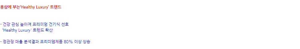 이는 정관장 제품 중, 가장 성장률이 높은 제품에 속하며 본인을 위한 ‘가치소비(스몰 럭셔리:Small Luxury)'에 건강에 대한 관심이 더해져 ’Healthy Luxury(헬시 럭셔리: 건강을 위한 가치소비)' 트렌드로 연결되는 상황이다.