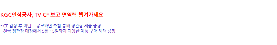 한편, KGC인삼공사는 인기 선물세트와 주요 제품 구매 시 다양한 구매 혜택을 받을 수 있는 ‘면역력을 선물하세요’ 행사를 5월 15일까지 전국 정관장 매장에서 진행한다.