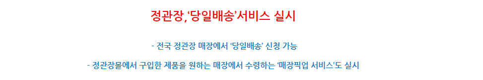 정관장 ‘당일배송’ 서비스를 희망하는 고객들은 10월 2일 정오까지 전국 정관장 매장에서 배송 가능 지역 여부를 확인 후 신청하면 된다. ‘당일배송’ 서비스는 전국의 정관장 매장에서 신청이 가능하며, 20만원 이상 구매 고객에게는 무료로 ‘당일배송’ 서비스를 제공한다.