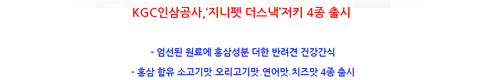신제품 ‘지니펫 더스낵’은 총 4종으로 ‘홍삼함유 소고기맛 저키’, ‘홍삼함유 오리고기맛 저키’, ‘홍삼함유 연어맛 저키’, ‘홍삼함유 치즈맛 저키’다.