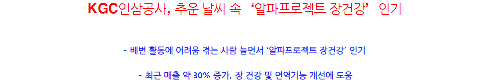 한편, KGC인삼공사는 정관장몰에서 ‘정관장’ 제품 구매 시 ‘알파프로젝트 장건강’ 3일분을 증정하는 이벤트를 오는 27일까지 진행한다. <끝>