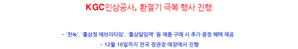 KGC인삼공사(대표이사 박정욱)는 프리미엄 녹용브랜드 ‘천녹’ 제품과 ‘홍삼정 에브리타임’, ‘홍삼달임액’ 등 제품 구매 시 다양한 혜택을 제공하는 환절기 극복 행사를 12월 10일까지 진행한다.