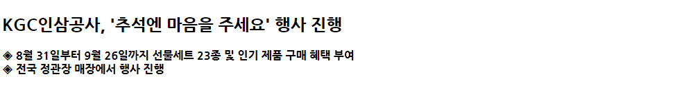 KGC인삼공사는 추석을 앞두고 ‘추석엔 마음을 주세요’ 행사를 전국 정관장 매장에서 진행한다.
